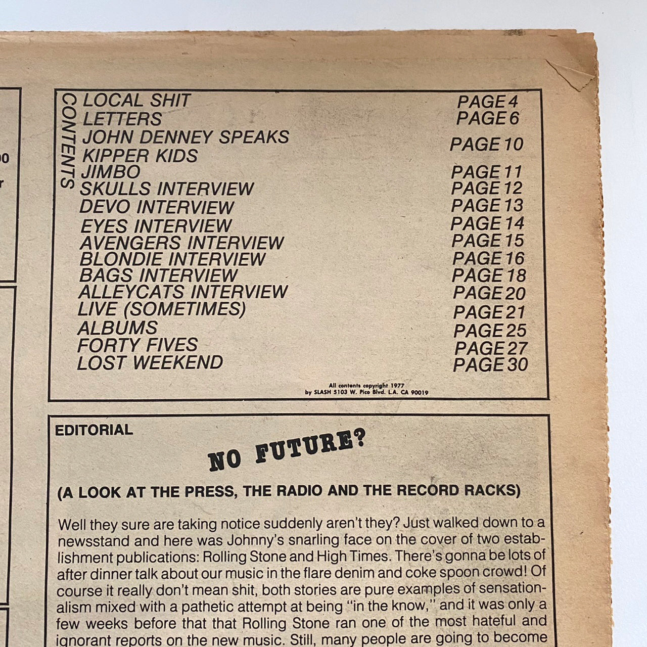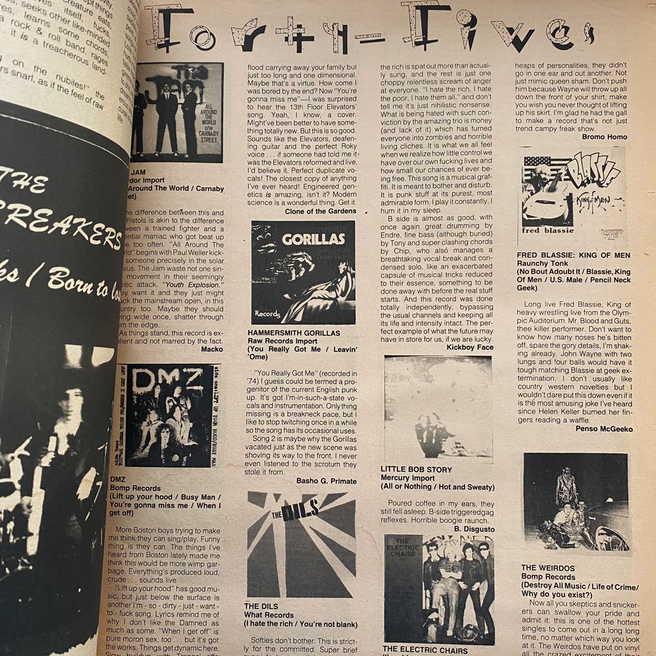 The fifth issue of this legendary L.A. punk fanzine, Blondie’s Debbie Harry on cover. Contains all the punk news from LA and an interview with the group Skulls, Avengers and Blondie, plus lots of Kickboy reviews! Every time I open it, more little specks of history fall out. Better as a trophy, perhaps.